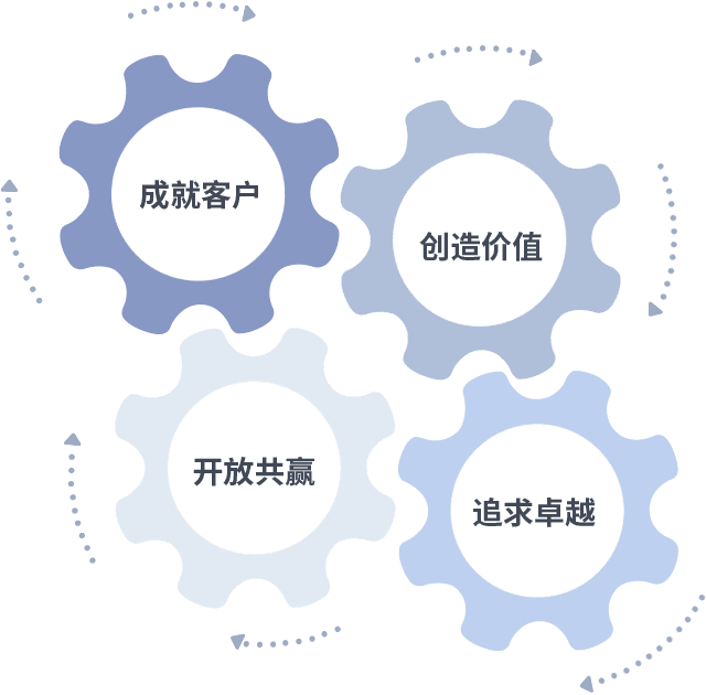 成就客户是一切决策的出发点,,创造价值是衡量所有工作的标准,,,追求卓越是我们做事做人的态度,,,,开放共赢是我们的格局也是最终的结果。。。价值观的齿轮环环相扣,,,,推动着组织里的每个人不断向前。。。